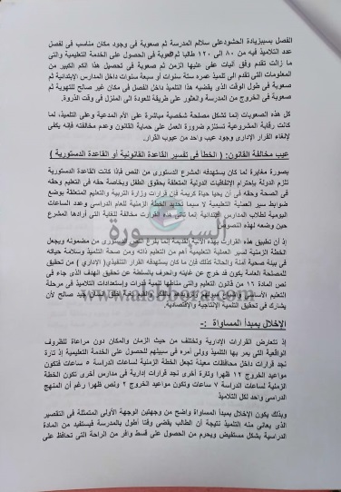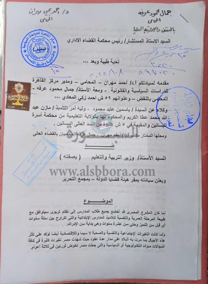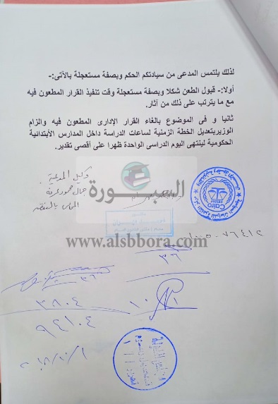 تداول عدد من نشطاء مواقع التواصل الاجتماعي "فيسبوك" مستندات لدعوي قضائية بشأن تخفيض عدد ساعات اليوم الدراسى فى المدارس الابتدائية على مستوى الجمهورية وانصراف التلاميذ فى الواحدة بدلا من الساعة الثانية والنصف.