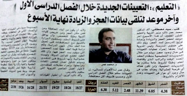 أكد الدكتور محمد عمر نائب وزير التربية والتعليم لشئون المعلمين لجريدة " الاهرام المسائى " ان الاسبوع الحالى هو اخر موعد لحصر العجز والزيادة واعادة توزيع المعلمين على المدارس لسد العجز وسيتم ذلك فى كل مدرسة على ان يبدأ بعدها اجراءات وخطوات التعيينات الجديدة فى حال وجود عجز بعد التوزيع وسيتم ذلك من خلال المديريات فى مختلف محافظات الجمهورية بنظام العقد المحدد للوقت والراتب الذى سوف يتقاضاه المعلم الذى يتم التعاقد معه وفقا لشروط ستلتزم بها المديريات ولن يكون هناك عشوائبة فى التعيينات