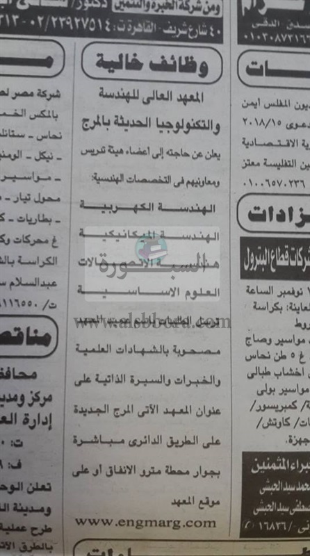 يعلن المعهد العالى للهندسة والتكنولوجيا الحديثة بالمرج عن حاجته الى اعضاء هيئة التدريس ومعاونيهم فى التخصصات الهندسية وعلى الراغبين فى الحصول على الوظيفة ارسال الطلبات باسم عميد المعهد مصحوبة بالشهادات العلمية والخبرات والسيرة الذاتية عبر الموقع المنشور فى اعلان جريدة الجمهورية اليوم الخميس الموافق اول نوفمبر 2018.