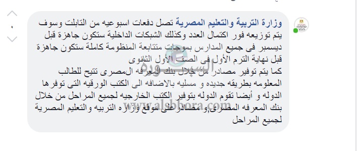 الوزارة علي تسألت عبير قائلة"تصل دفعات اسبوعيه من التابلت وسوف يتم توزيعه