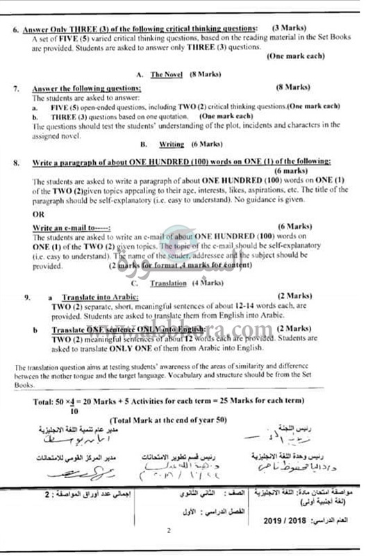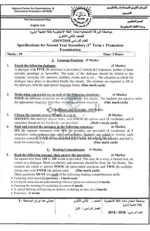 أعلن المركز القومى للامتحانات والتقويم التربوى التابع لوزارة التربية والتعليم والتعليم الفنى، مواصفات الورقة الامتحانية لمادة اللغة الانجليزية للصف الثانى الثانوى العام للعام الدراسى الحالى 2019/2018، والتى جاءت كالتالى: