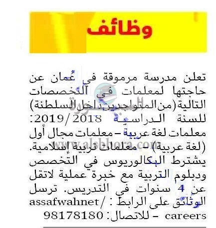 أعلنت مدرسة خاصة في سلطنة عمان عن وظائف جديدة للمعلمين والمعلمات وذلك وفقا لنص الإعلان التالي:-