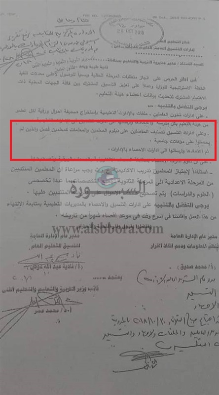 ارسلت وزارة التربية والتعليم والتعليم الفنى خطابا الى جميع المديريات والادارات التعليمية بشأن تصنيف الحاصلين على دبلوم المعلمين والمعلمات كمعلمين فصل والذين لم يحصلوا على مؤهلات جامعية، ثم اعتمادها وارسالها الى ادارات الاحصاء.