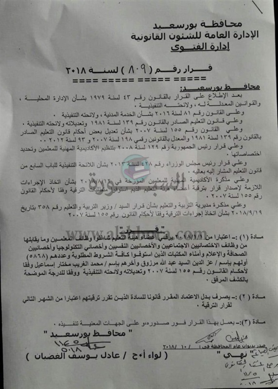 اعلن اللواء عادل الغضبان محافظ بورسعيد بشرة سارة للعاملين بالتربيه والتعليم بعد ان اصدر قرار رقم 809 لسنه 2018 بترقية 5868 من المعلمين والاخصائين بمديرية التربيه والتعليم ببورسعيد على ان يتم اعتبار القرار ساريا من اول يناير 2018.