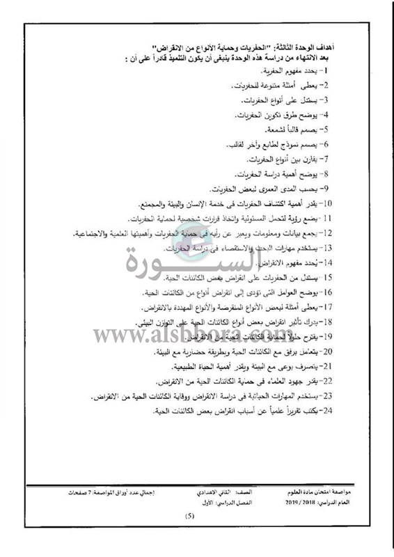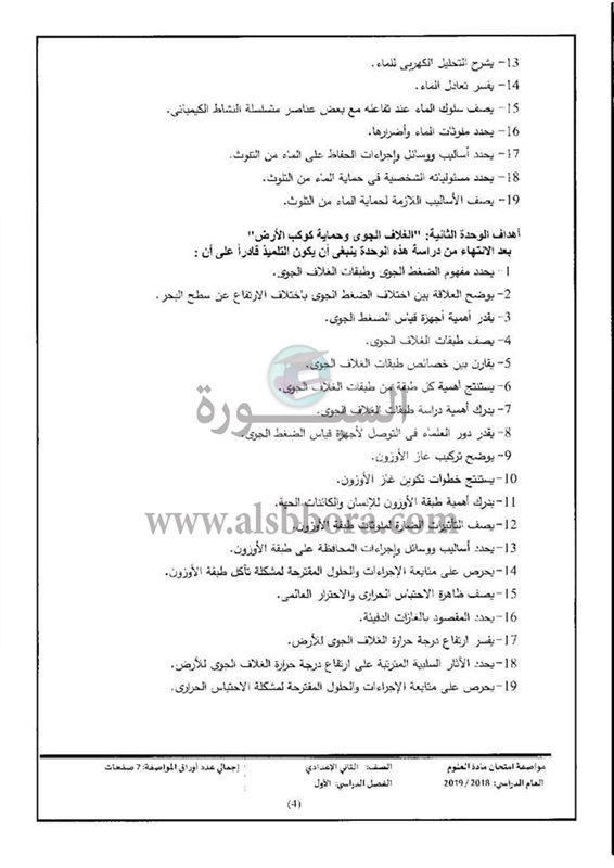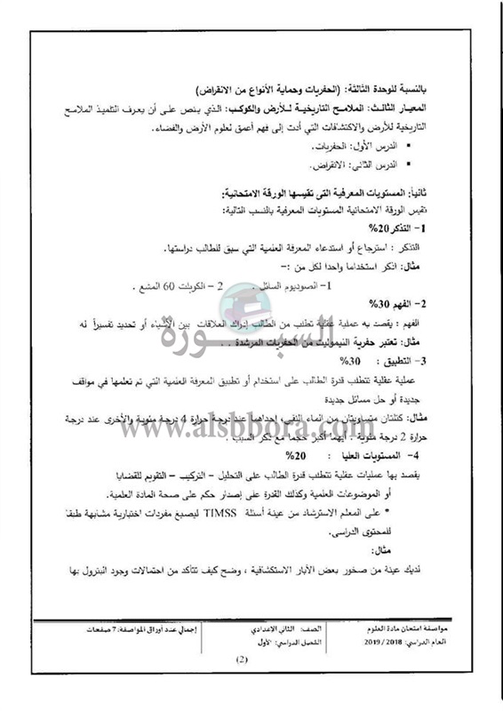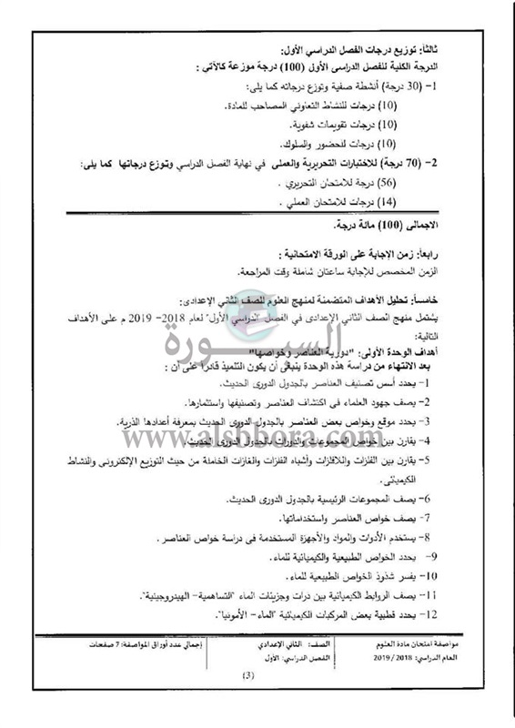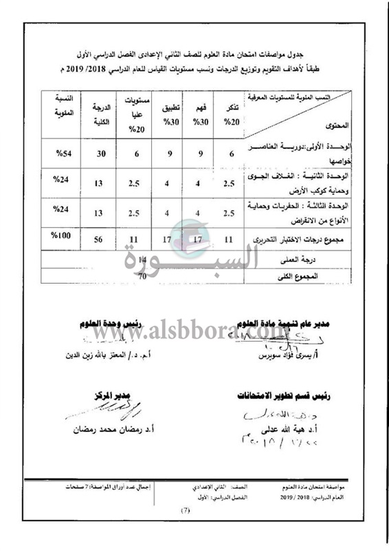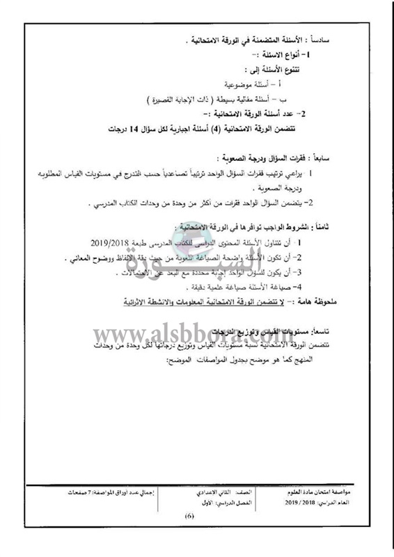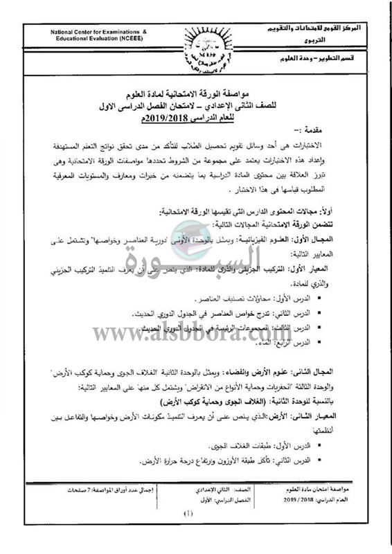مواصفات الورقة الامتحانية لمادة العلوم للصف الثانى الاعدادى 2019/2018