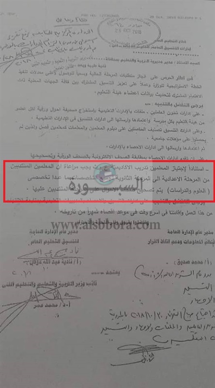 ارسلت وزارة التربية والتعليم والتعليم الفنى خطابا رسميا الى جميع المديريات التعليمية والادارات، حيث جاء فى الخطاب انه استنادا لاجتياز المعلمين تدريب الاكاديمية "ع،ث" يجب مراعاة ان المعلمين المنتدبين من المرحلة الاعدادية الى المرحلة الثانوية لجميع التخصصات ما عدا تخصصى "العلوم والدراسات" يتم تصحيح صحف الأحول على المرحلة المنتدبين عليها.