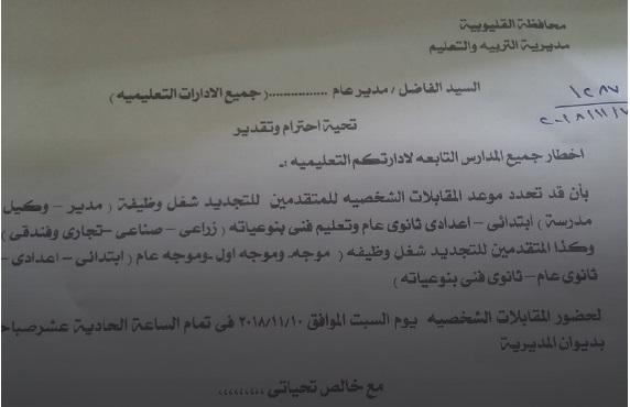 اعلنت مديرية التربية والتعليم بالقليوبية تحديد موعد للمقابلات الشخصية للمتقدمين لتجديد شغل وظيفة "مدير - ووكيل -وموجه للمدارس بجميع المراحل ابتدائى - اعدادى- ثانوى عام - ثانوى زراعى - صناعى - تجارى وفنى"