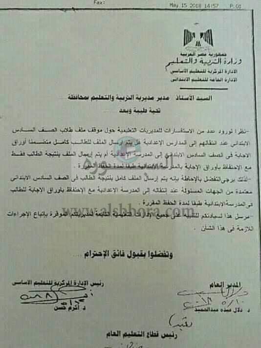 ارسلت وزارة التربية والتعليم خطابا مهما الى جميع المديريات التعليمية بشأن ارسال الملف الكامل بنتيجة الطالب فى الصف السادس الابتدائى معتمدة من الجهات المسئولة عند انتقاله الى المدرسة الاعدادية مع الاحتفاظ باوراق الاجابة للطالب فى المدرسة الابتدائية طبقا لمدة الحفظ المقررة.