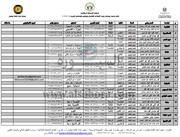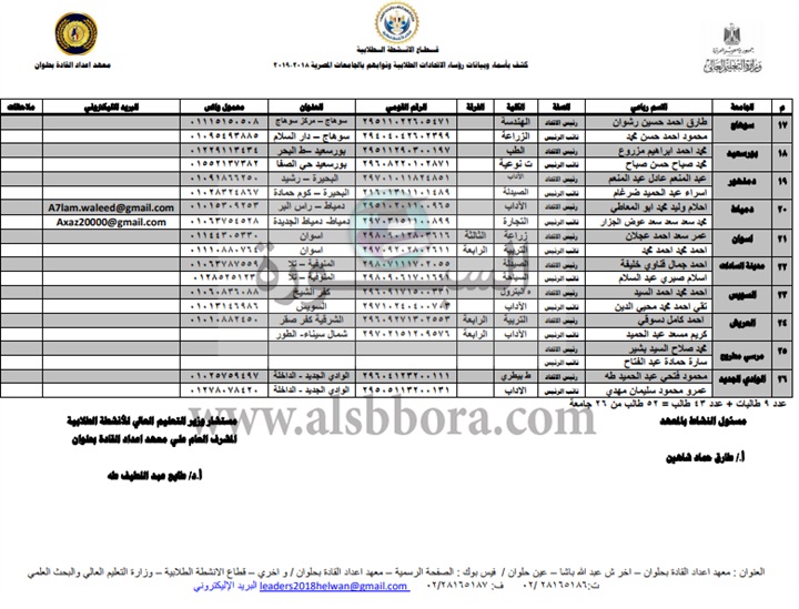 قائمة بأسماء وبيانات رؤساء الاتحادات الطلابية ونوابهم بالجامعات المصرية 2018/2019.."مستند"