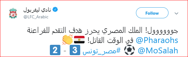 احتفلت صفحة ليفربول الانجليزى بهدف محمد صلاح الثالث والذى احرزه فى مرمى منتخب تونس فى الوقت القاتل، حيث علقت على الهدف بـ "جووووول الملك المصرى يحرز هدف التقدم للفراعنة فى الوقت القاتل".