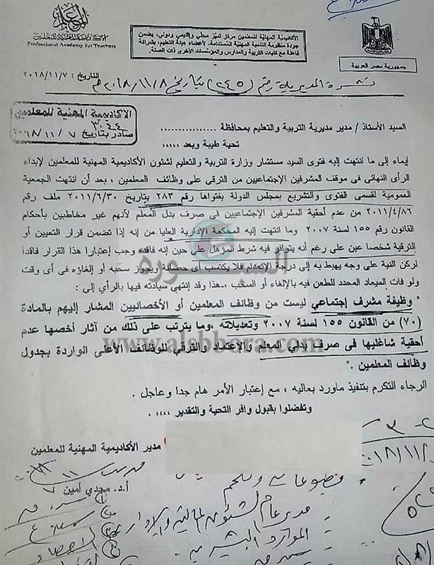 ارسلت الاكاديمية المهنية للمعلمين خطاب مهما الى جميع المديريات والادارات التعليمية ومديرى المدارس بشأن المشرفين الاجتماعيين بانهم ليس مخاطبين بقانون الكادر 155 لسنة 2007، وتعديلاته وبالتالي لايحق لهم الترقي على قانون الكادر ولايستحقوا صرف بدل معلم وبدل الإعتماد.