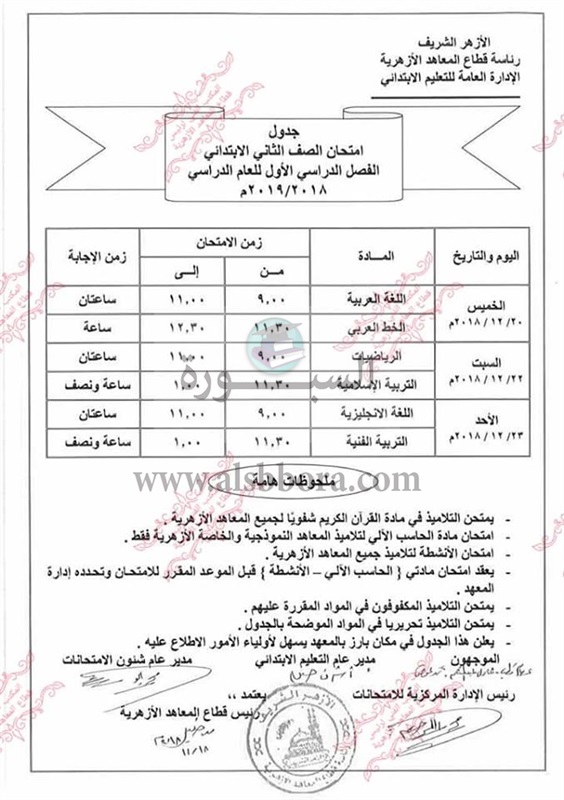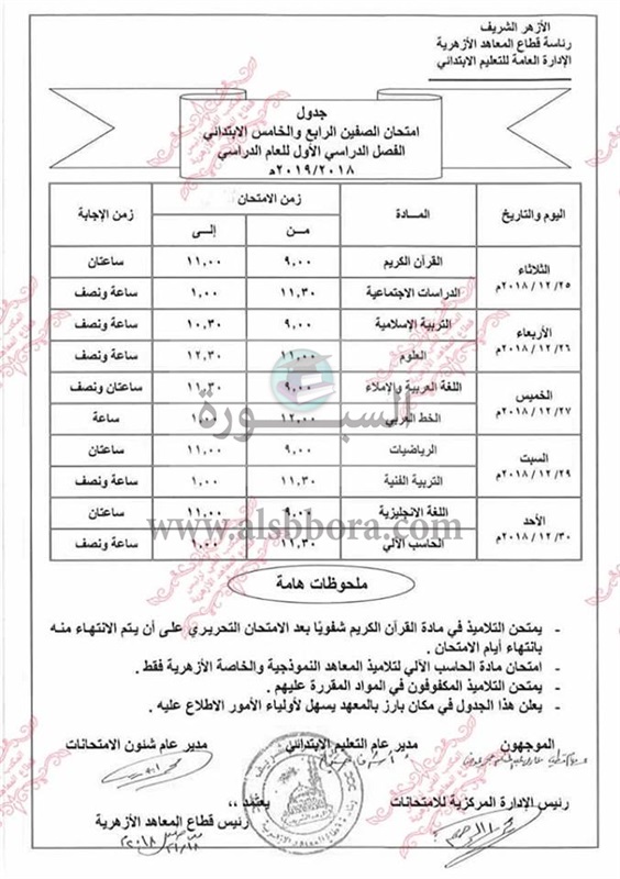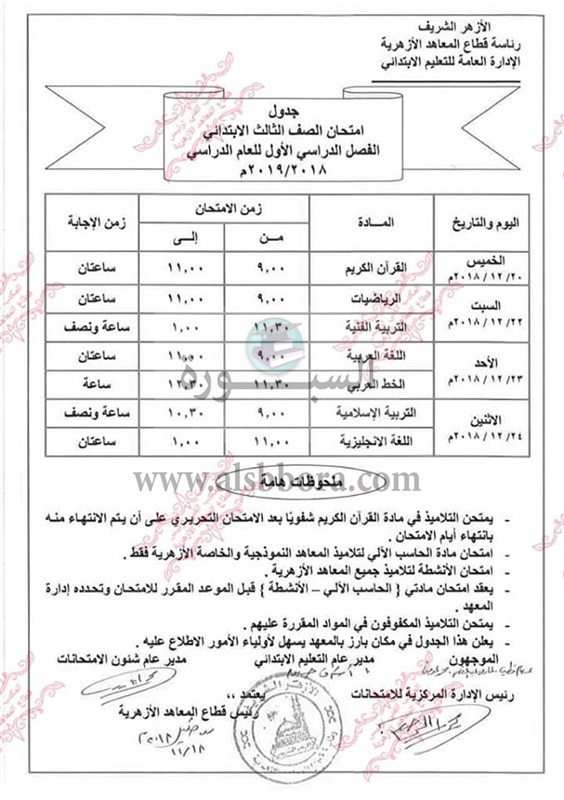 ينشر موقع السبورة جدول امتحانات المرحلة الابتدائية الأزهرية للترم الأول للعام الدراسى 2019/2018، والذى سوف يبدأ فى 20 وينتهى فى 30 ديسمبر المقبل 2018.
