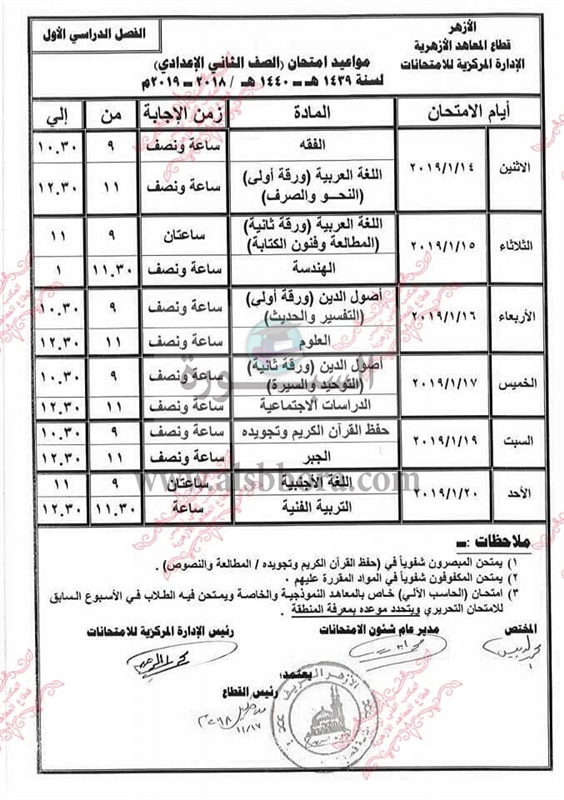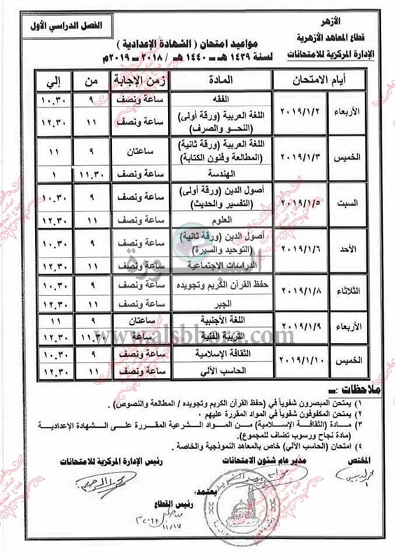 ينشر موقع السبورة جداول امتحانات الترم الأول للمرحلة الاعدادية الازهرية "الصفوف الأول والثانى والثالث" والتى سوف تبدأ فى 2 يناير، وتنتهى فى 20 يناير 2019.