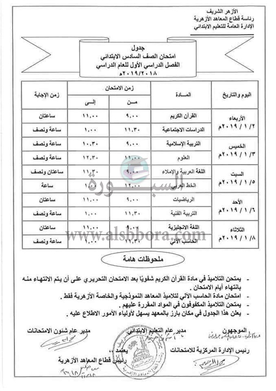 ينشر موقع السبورة جدول امتحانات الصف السادس الابتدائى الأزهرى والذى سوف يبدأ فى 2 يناير، وينتهى فى 8 يناير 2019، حيث تبدأ الامتحانات بمادتى القرآن الكريم والدراسات الاجتماعية، وتنتهى يوم 8 يناير بمادتى اللغة الانجليزية والحاسب الآلى.