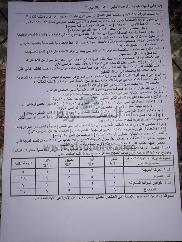 مواصفات الورقة الامتحانية لمادة الفيزياء للصف الثانى الثانوى