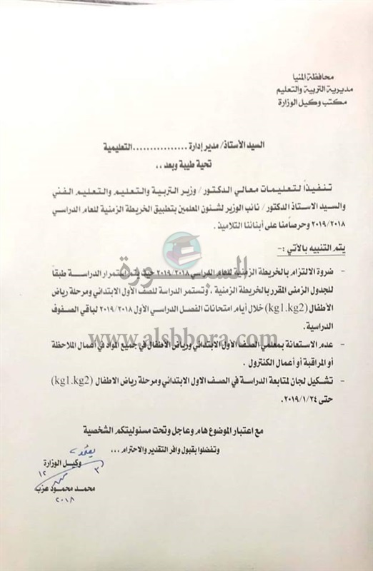 جاء ذلك تنفيذا لتعليمات الدكتور طارق شوقي وزير التربية والتعليم والتعليم الفني، والدكتور محمد عمر نائب وزير التربية والتعليم لشىون المعلمين، بتطبيق الخريطة الزمنية للعام الدراسي 2019/2018.