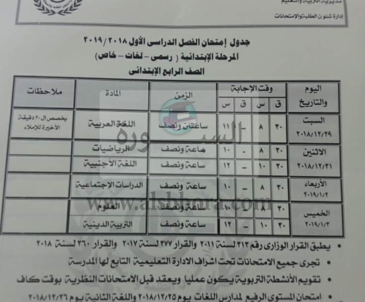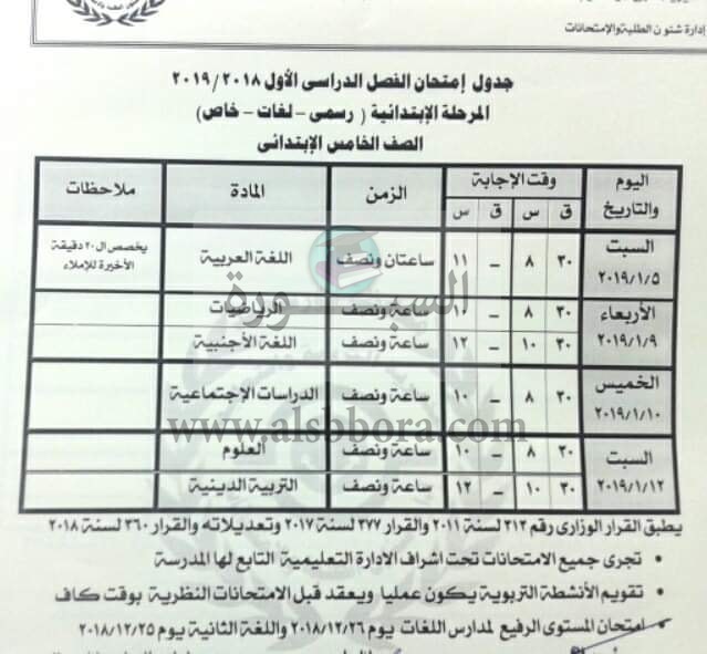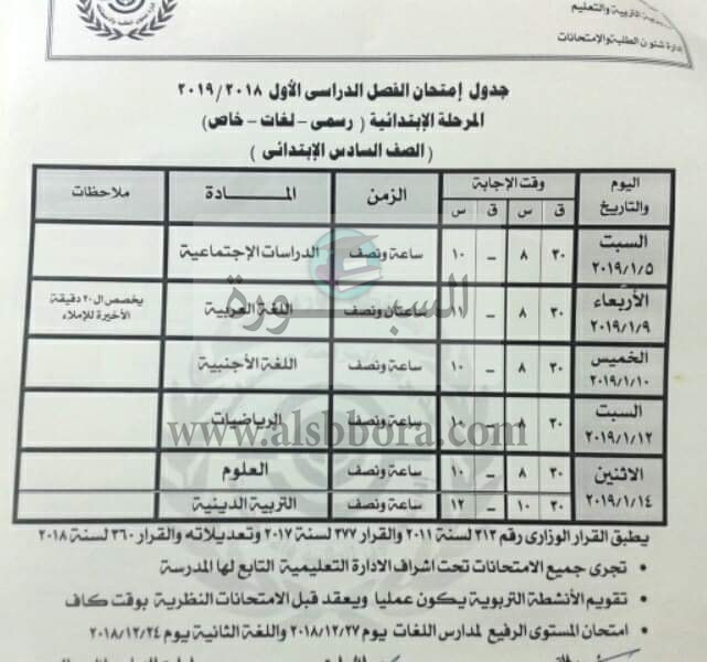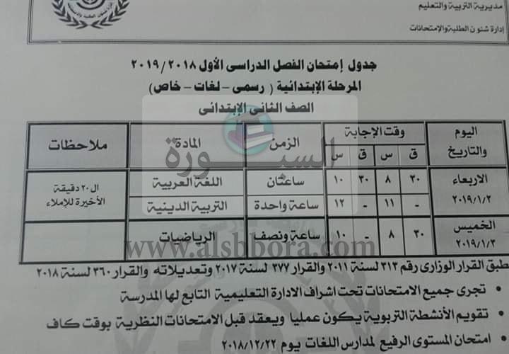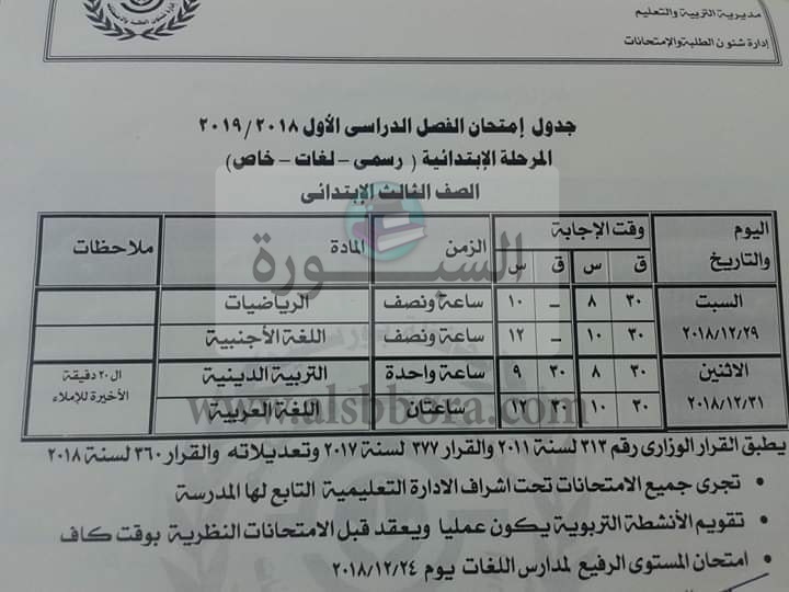 اعلنت مديرية التربية والتعليم بمحافظة بورسعيد عن جدول امتحانات الترم الأول للعام الدراسى الحالى 2019/2018، للمرحلة الابتدائية بداية من الصف الثانى الى السادس الابتدائى، والذى جاء كما يلى: