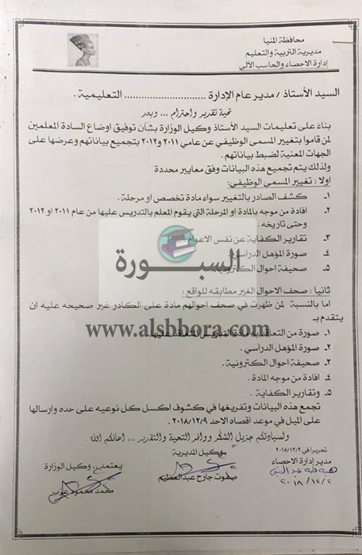 اعلنت ادارة الاحصاء والحاسب الآلى بمديرية التربية والتعليم بمحافظة المنيا عن 5 معايير يجب تطبيقها على المعلمين حال التقدم بطلب لتغيير المسمى الوظيفى، والتى جاءت كالتالى: