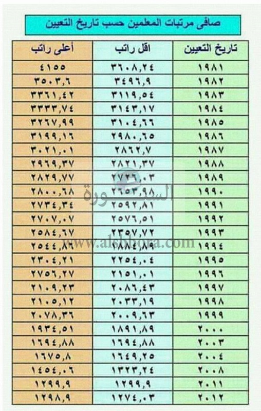 ينشر موقع السبورة صافى مرتبات المعلمين حسب تاريخ التعيين بداية من المعينين 1981 بحيث يصل اقل راتب 3608، واعلى راتب 4155 جنيهاـ بينما يأتى تعيين 2012 باقل راتب 1274 جنيها، وأعلى راتب 1298 جنيها.