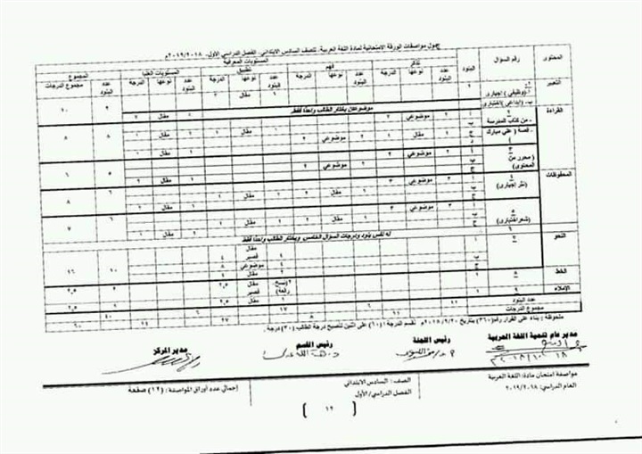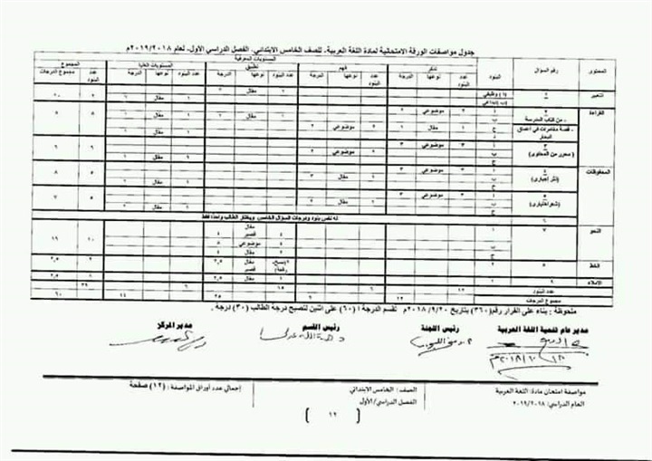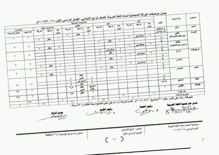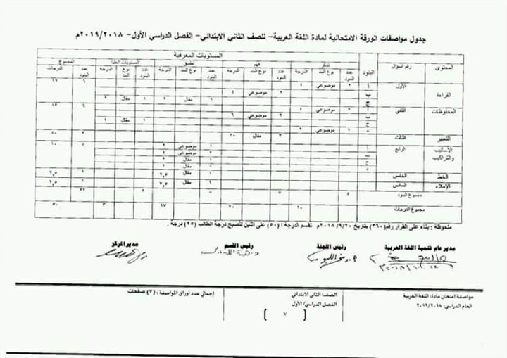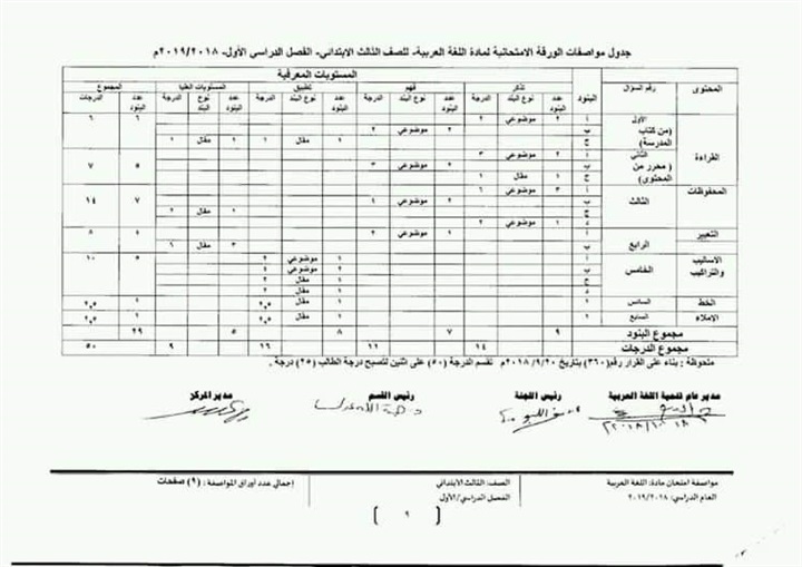 كشفت وزارة التربية والتعليم عن مواصفات الورقة الامتحانية لمادة اللغة العربية للمرحلة الابتدائية من الصف الثانى الى السادس الابتدائى للترم الاول للعام الدراسى 2019/2018، وجاءت كالتالى:
