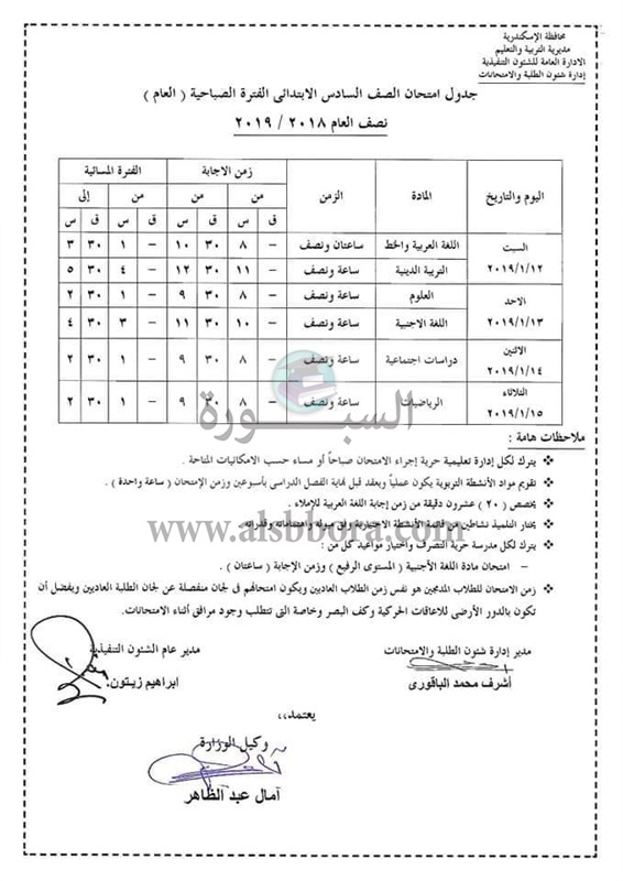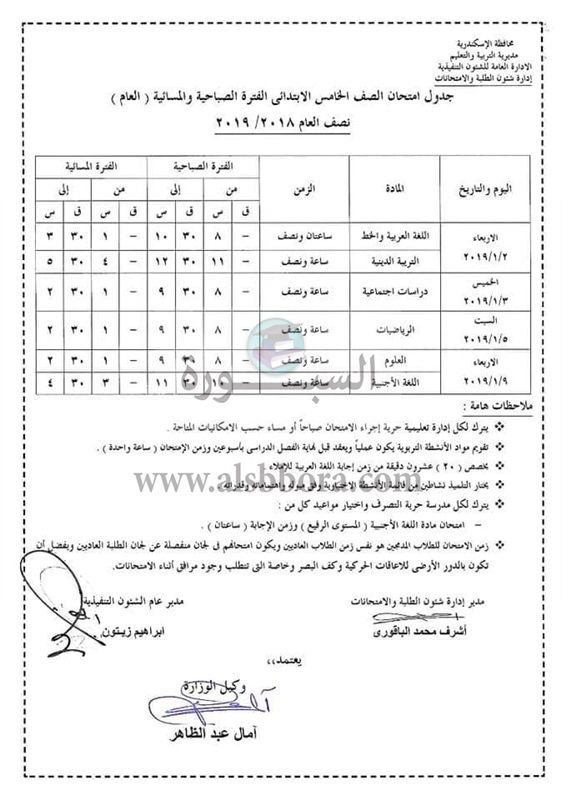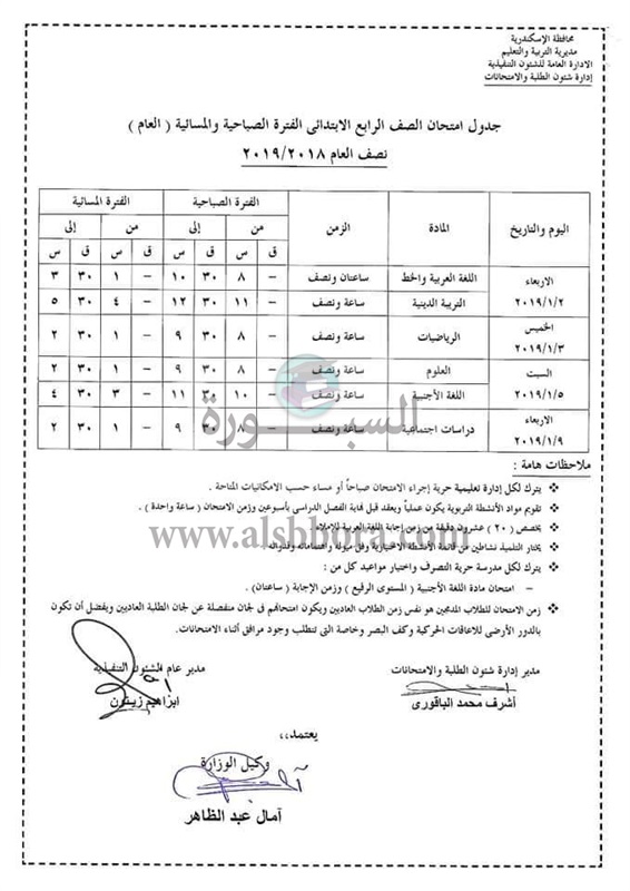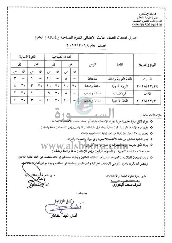 اعلنت مديرية التربية والتعليم بمحافظة الاسكندرية جدول امتحانات الترم الأول لصفوف المرحلة الابتدائية والتى سوف تبدأ من 29 ديسمبر 2018 الى 15 يناير 2019، حيث جاءت الجداول كالتالى:
