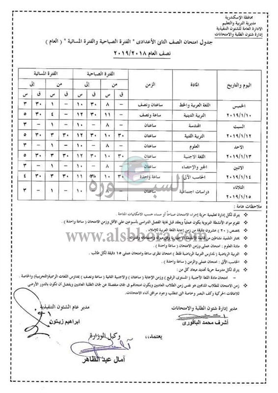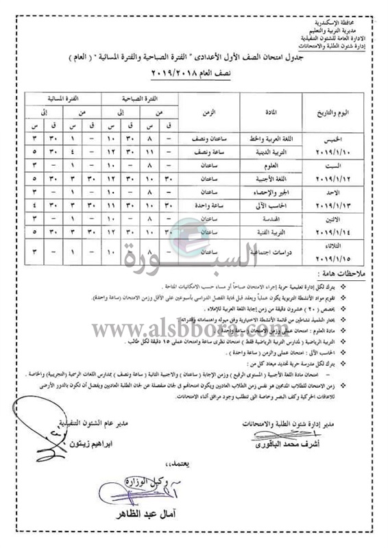 أعلنت مديرية التربية والتعليم بمحافظة الاسكندرية جدول امتحانات الترم الأول لصفوف المرحلة الاعدادية والتى سوف تبدأ من 10 يناير الى 24 يناير 2019، حيث جاءت الجداول كالتالى: