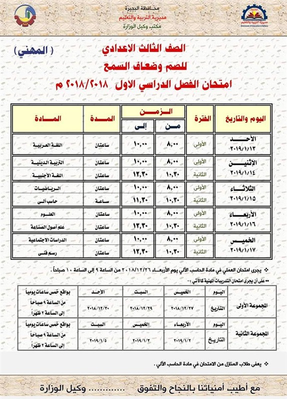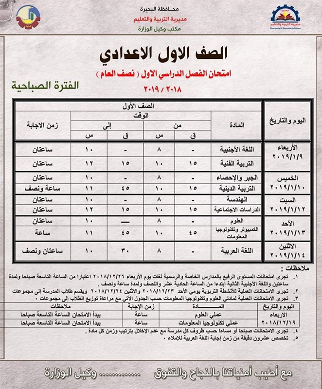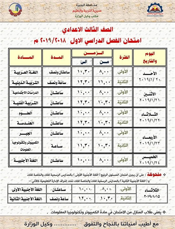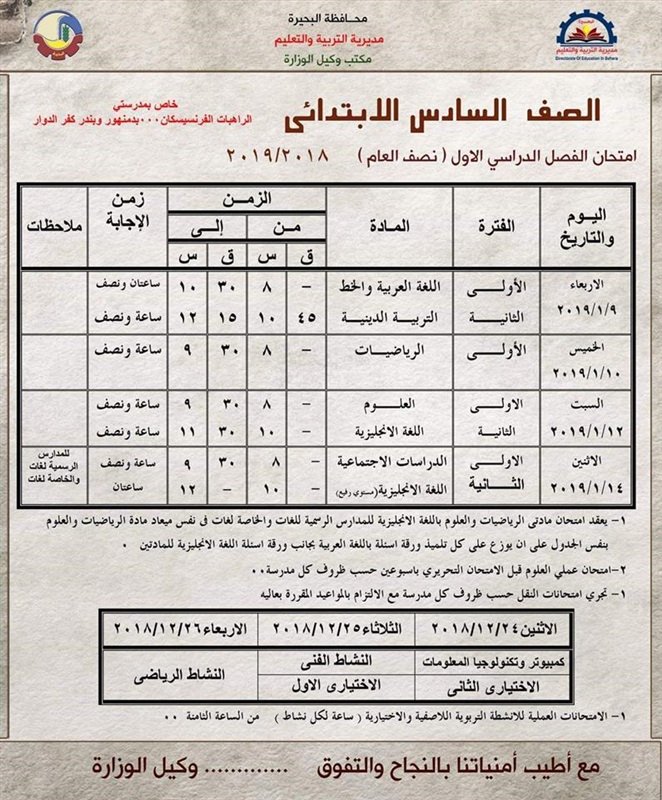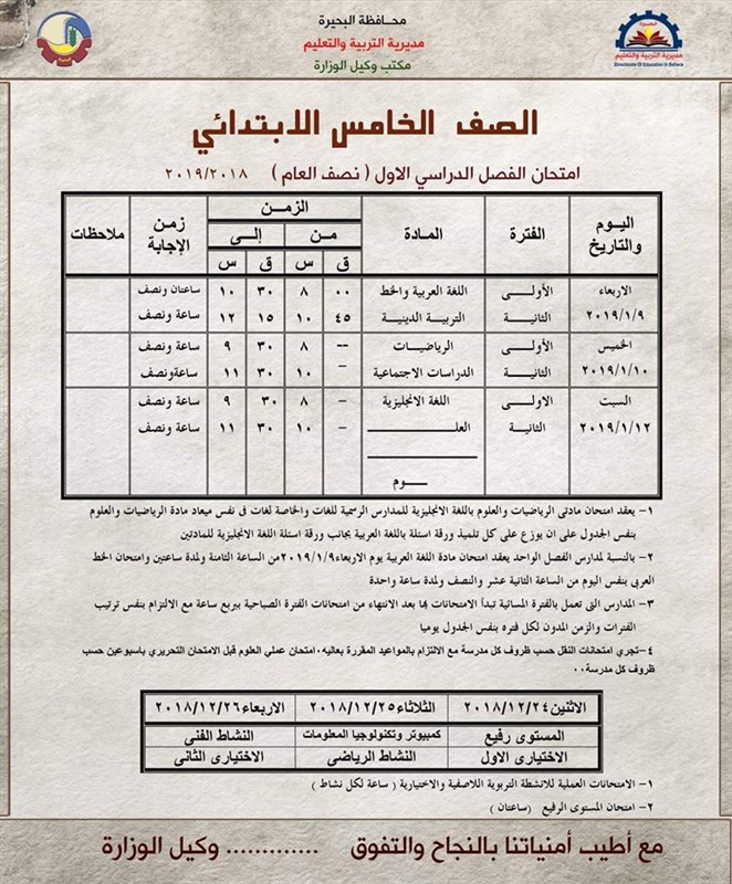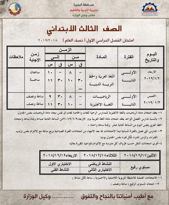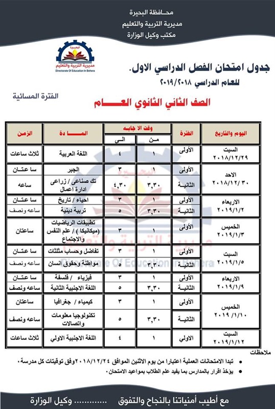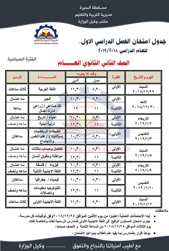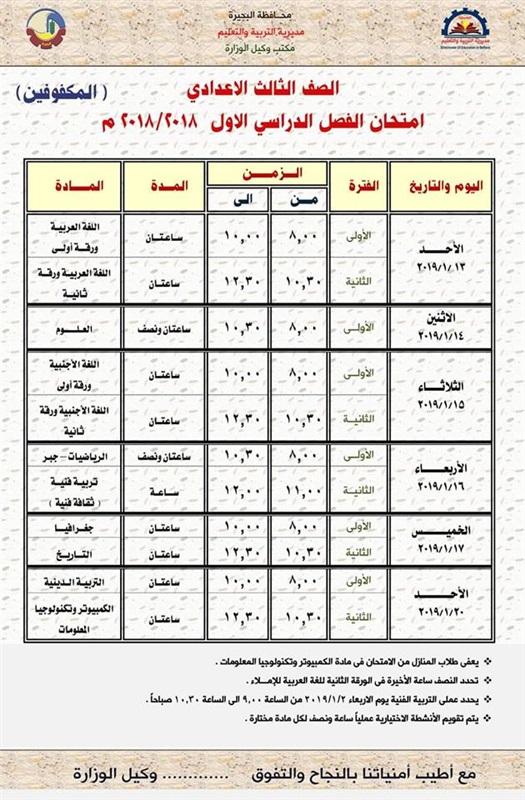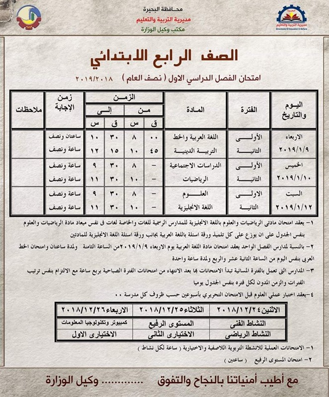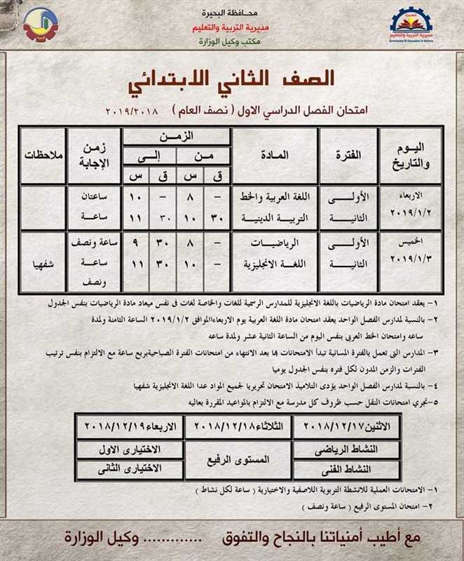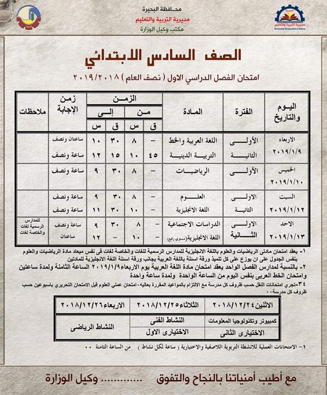 اعلنت مديرية التربية والتعليم بمحافظة البحيرة عن جدول امتحانات الترم الأول للعام الدراسى 2019/2018، لجميع المراحل التعليمية "الابتدائية والاعدادية والثانوية"، والتى جاءت كالتالى: