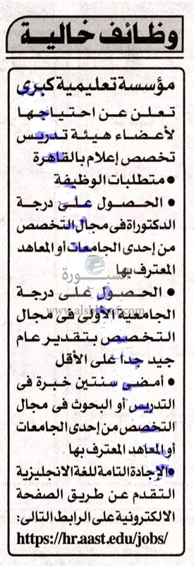 تعلن مؤسسة تعليمية كبرى عن حاجتها الى اعضاء هيئة التدريس، وعلى الراغبين فى التقدم ارسال السيرة الذاتية عبر الايميل المنشور فى جريدة الاهرام .