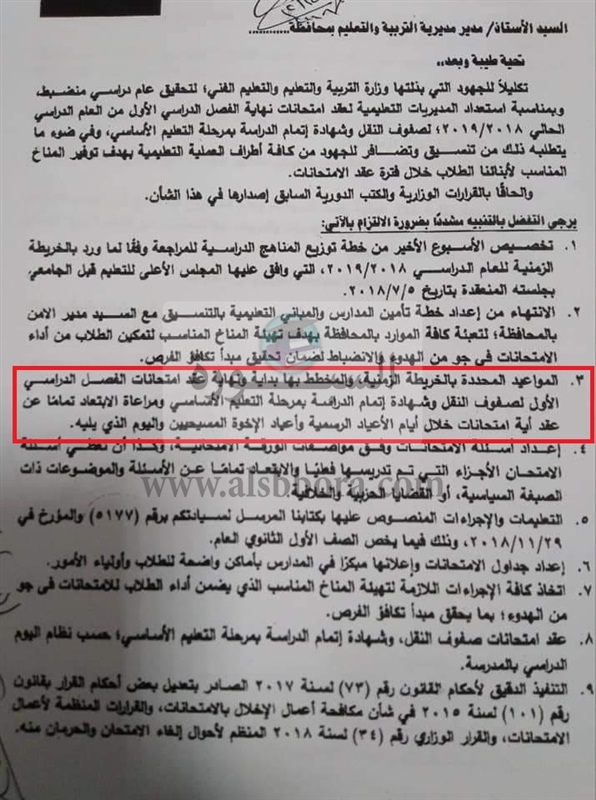 ارسلت وزارة التربية والتعليم خطابا مهما الى جميع المديريات التعليمية تحذر فيها المسئولين من عقد امتحانات اثناء اعياد الأخوة المسيحيين او اليوم الذى يليه، موضحة ان الامتحانات ممنوعة ايام 1 و2 و7 و8 و19 و20 يناير 2019، وعلى جميع المسئولين تطبيق هذه التعليمات ومن يخالف هذه التعليمات يعرض نفسه للمساءلة القانونية.