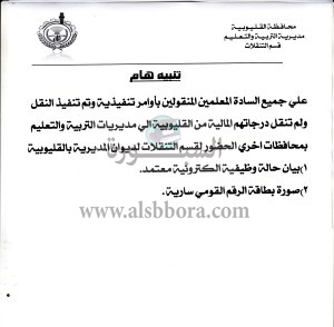 طالبت مديرية التربية والتعليم بمحافظة القليوبية من جميع المعلمين المنقولين من مديرية التربية والتعليم بالقليوبية الي مديريات التربية والتعليم بالمحافظات الاخري