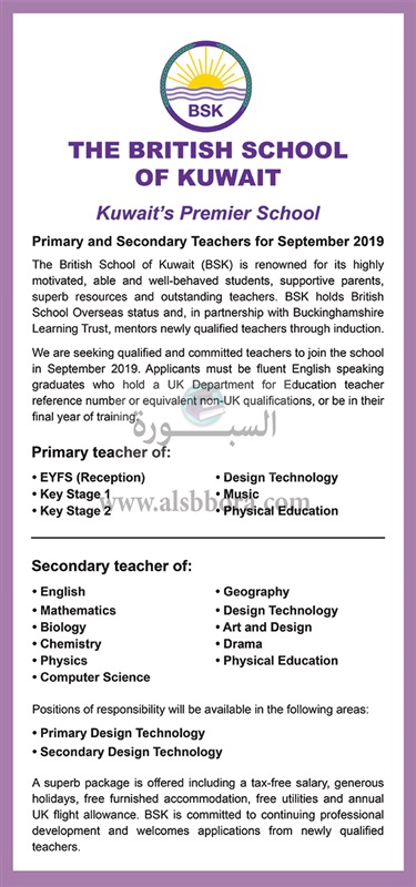 اعلنت المدرسة البريطانية بالكويت عن توفر وظائف تعليمية لجميع التخصصات والمراحل للعام الدراسى 2018/ 2019