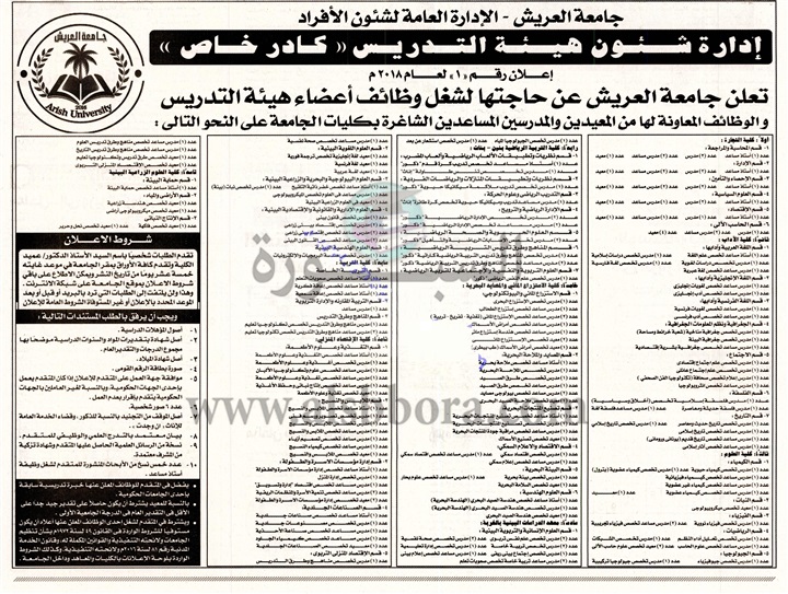 تعلن جامعة العريش عن وظائف جديدة لأعضاء هيئة التدريس "من معيد إلي أستاذ" وذلك وفقا لنص الإعلان التالي:-