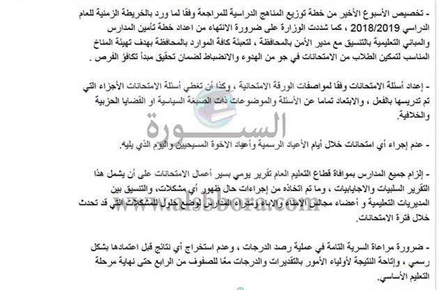 أرسلت وزارة التربية والتعليم عددا من التعليمات الهامة بشأن امتحانات نصف العام للمديريات والتي تضمنت تحذيرا لـ"المديريات" من عقد الامتحانات في هذه الأيام لجميع الصفوف الدراسية وهي كالتالي:-