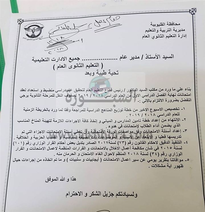 ارسلت وزارة التربية والتعليم والتعليم الفنى، خطابا مهما الى جميع المديريات التعليمية يحتوى الخطاب على تعليمات جديدة بشأن عقد امتحانات الترم الأول للعام الدراسى 2019/2018, حيث جاءت التعليمات فى الخطاب التالى: