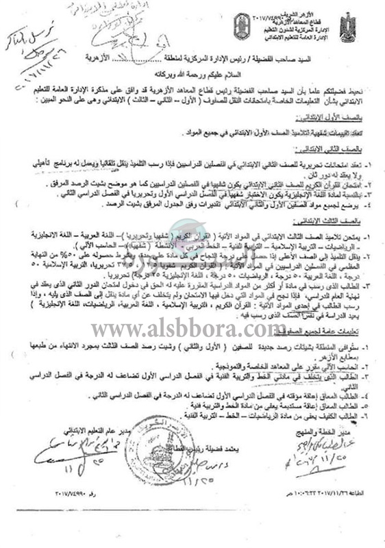 اعلن قطاع المعاهد الأزهرية عن التعليمات الخاصة بامتحانات المرحلة الابتدائية للترم الأول للعام الدراسى 2019/2018، والتى سوف تجرى فى آخر ديسمبر وأوائل يناير المقبل، حيث جاءت التعليمات فى الخطاب التالى: