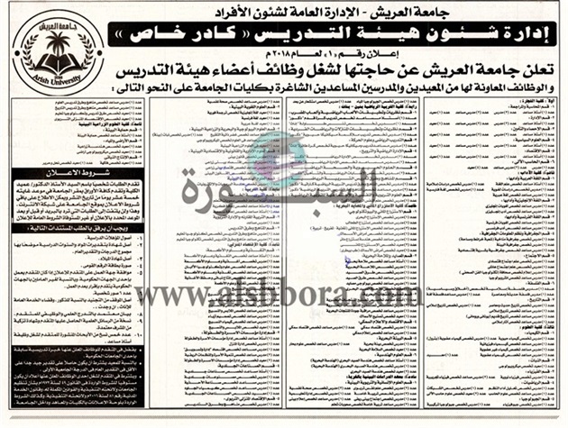 حيث أعلنت جامعة العريش، عبر موقعها الإلكتروني عن حاجتها لشغل وظائف أعضاء هيئة التدريس، والوظائف المعاونة لها من المعيدين والمدرسين المساعدين الشاغرة بكليات (التجارة- العلوم- الآداب- التربية الرياضية- الاقتصاد المنزلي- التربية) وغيرها ، وذلك على النحو التالي: