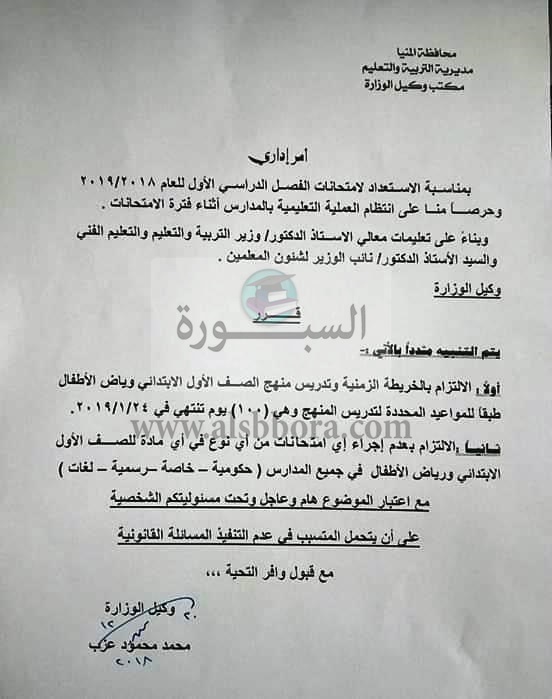 وكذلك الالتزام بعدم إجراء أي امتحانات من أي نوع في أي مادة للصف الأول الابتدائي ورياض الأطفال في جميع المدارس "حكومي -خاصة- رسمية - لغات".