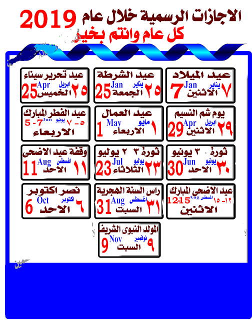 15 يوما اجازات وعطلات رسمية مدفوعة الأجر فى 2019