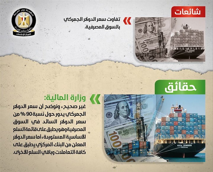 وأوضحت الوزارة ان سعر الدولار الجمركى يدور حول نسبة 90% من سعر الدولار السائد فى السوق المصرفية وهو يطبق على قائمة السلع الاساسية المستوردة، اما سعر الدولار المعلن من البنك المركزى يطبق على كافة التعاملات وباقى السلع الأخرى.