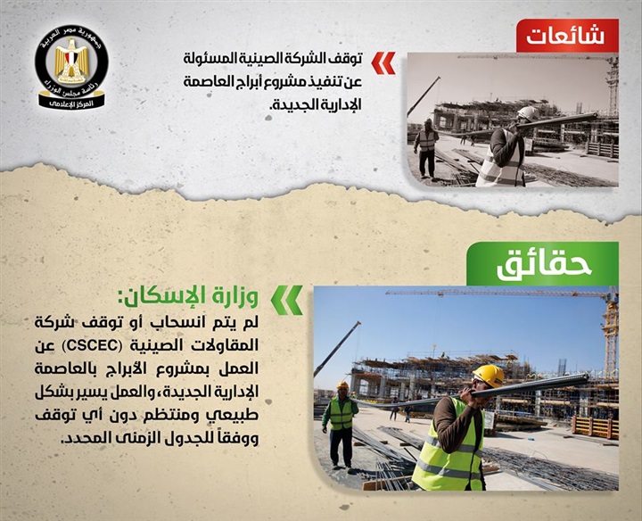 كشف مركز المعلومات بمجلس الوزراء حقيقة الشائعات الدائرة بشأن توقف الشركة الصينية المسئولة عن تنفيذ مشروع ابراج العاصمة الادارية الجديدة.