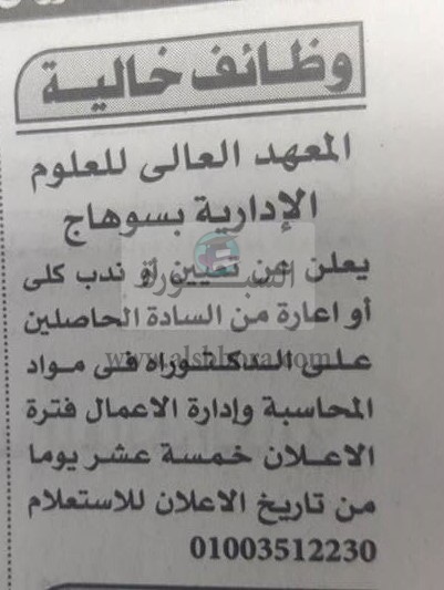 يعلن المعهد العالى للعلوم الادارية بسوهاد عن تعيين او ندب كلى او اعارة من الحاصلين على الدكتوراة فى مواد المحاصبة وادارة الاعمال، وعلى الراغبين فى الحصول على الوظيفة التقديم خلال 15 يوما من تاريخ نشر الاعلان على ارقام التليفون المنشور فى الاعلان التالى: