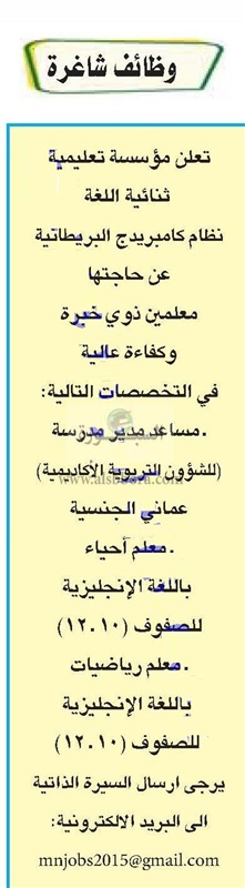 تعلن مدرسة خاصة في سلطنة عمان تعلن عن وظائف جديدة للمعلمين والمعلمات وذلك وفقا لنص الإعلان التالي :-