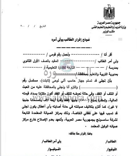 بالمستندات.. التعليم تلزم أولياء الامور على التوقيع باستلام التابلت و فى حالة فقده دفع ٤٥٠٠ جنيه
