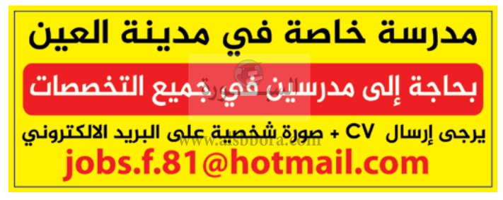 تعلن مدارس العين الإماراتية عن وظائف جديدة للمعلمين والمعلمات في جميع المواد وذلك وفقا لنص الإعلان التالي:-