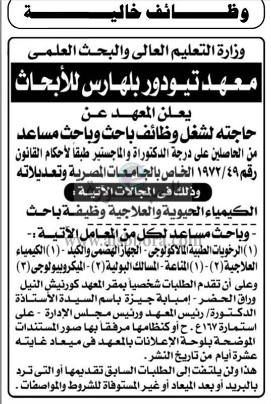 اعلنت وزارة التعليم العالى والبحث العلمى عن حاجة معهد تيودوربلهارس للأبحاث لباحثين وباحثين مساعدين من الحاصلين على درجة الدكتوراة والماجستير طبقا لاحكام القانون رقم 49 لسنة 1972 الخاص بالجامعات المصرية وتعديلاته، وعلى الراغبين فى الحصول على الوظيفة تقديم الطلبات شخصيا بمقر المعهد على العنوان المنشور فى الاعلان التالى: