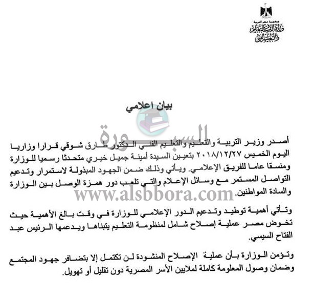 اصدر الدكتور طارق شوقى وزير التربية والتعليم قرارا وزاريا جديدا بتعيين امينة جميل متحدثا رسميا للوزارة ومنسقا عاما للفريق الاعلامى ويأتى ذلك صمن الجهود المبذولة لاستمرار وتدعيم التواصل المستمر مع وسائل الاعلام والتى تلعب دور همزة الوصل يسن الوزارة والمواطنين.