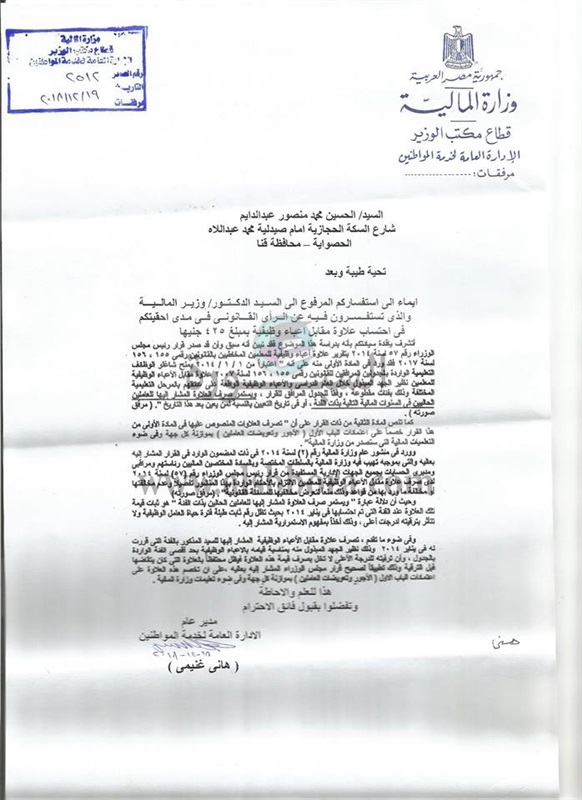 وزارة المالية : علاوة الاعباء الوظيفية للمعلمين والاخصائين 425 جنيه للمعلم المساعد و400 للمعلم و475 للمعلم أول و300 لـ " الكبير " ومستمرة