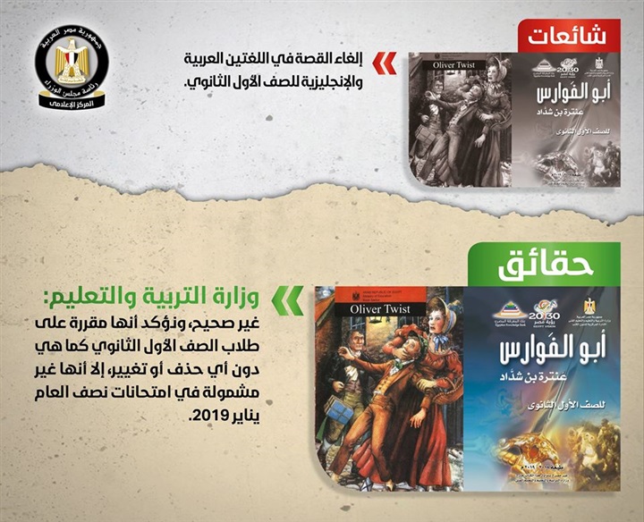 وتواصل المركز مع وزارة التربية والتعليم والتى اكدت ان ما يتم تداوله بشأن الغاء القصة فى مادتى اللغة العربية والانجليزية غير صحيح، موضحة انها مقرر على طلاب الصف الأول الثانوى كما هى دون اى حذف او تغيير، الا انها غير مشمولة فى امتحانات نصف العام يناير 2019.