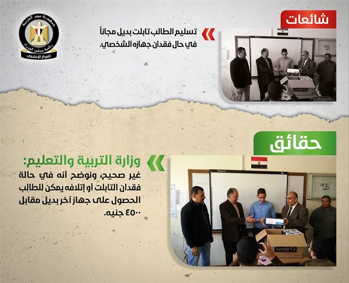 وتواصل المركز مع وزارة التربية والتعليم والتى اكدت ان ما يتم تداوله بشأن المقابل المادى الذى سوف يدفعه طالب الصف الأول الثانوى حال فقدان التابلت.غير صحيح، موضحة انه فى حالة فقدان التابلت او اتلافه يمكن للطالب الحصول على جهاز آخر بديل مقابل 4500 جنيه.