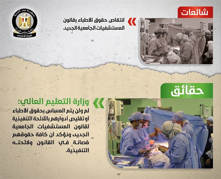 كشف مركز المعلومات عن حقيقة الأخبار المتداولة عبر المواقع الالكترونية والسوشيال ميديا بشأن انتقاص حقوق الاطباء بقانون المستشفيات الجامعية الجديد.